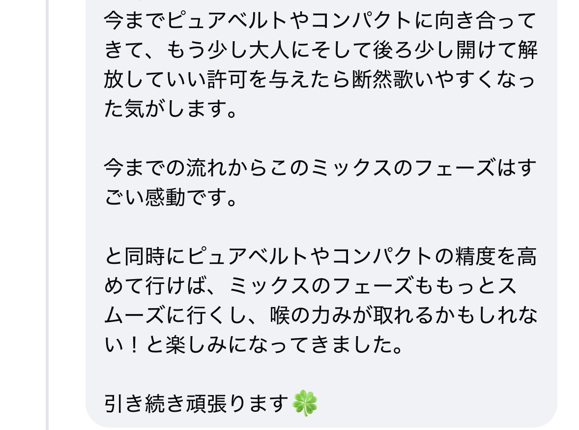 難しいなって点は、ピュアベルトやってベルティーミックス交互いにやったらいいとのことで、グリップを手放すが難しい。今もちょっとやると疲れる。不完全な状態が続くと疲れます。未開発だからですかね?メルマガの画像見て以降は、少しずつ発声がまた変わってきている。ピュアベルトとベルティーミックスの違いはわかるけど、感情を18歳にするのがすごく難しい!!でもBELTYMIXにすると喉の負担がちがう、表現が自由になる。曲でやると違いわかる!